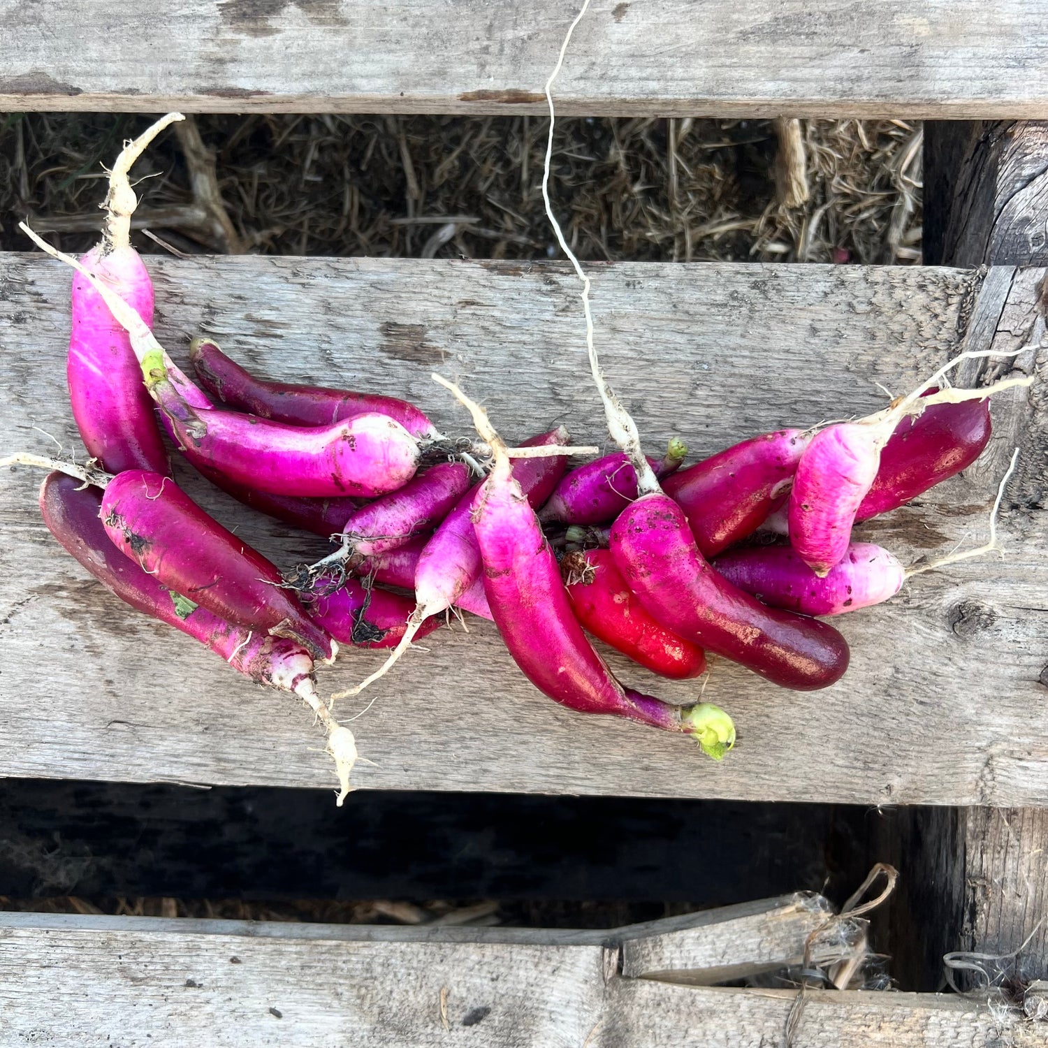 These fun-colored French Breakfast radishes have the sweet, zingy flavor for radishes but are purple! They add excitement to raw snacking or even to roasting or pickling.